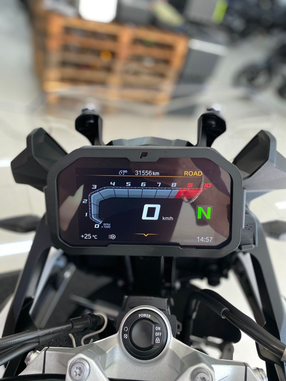 Suspensão Traseira: Duplo braço oscilante em alumínio fundido, amortecedor central, ajuste hidráulico da pré-carga da mola ajustável, amortecedor ajustável