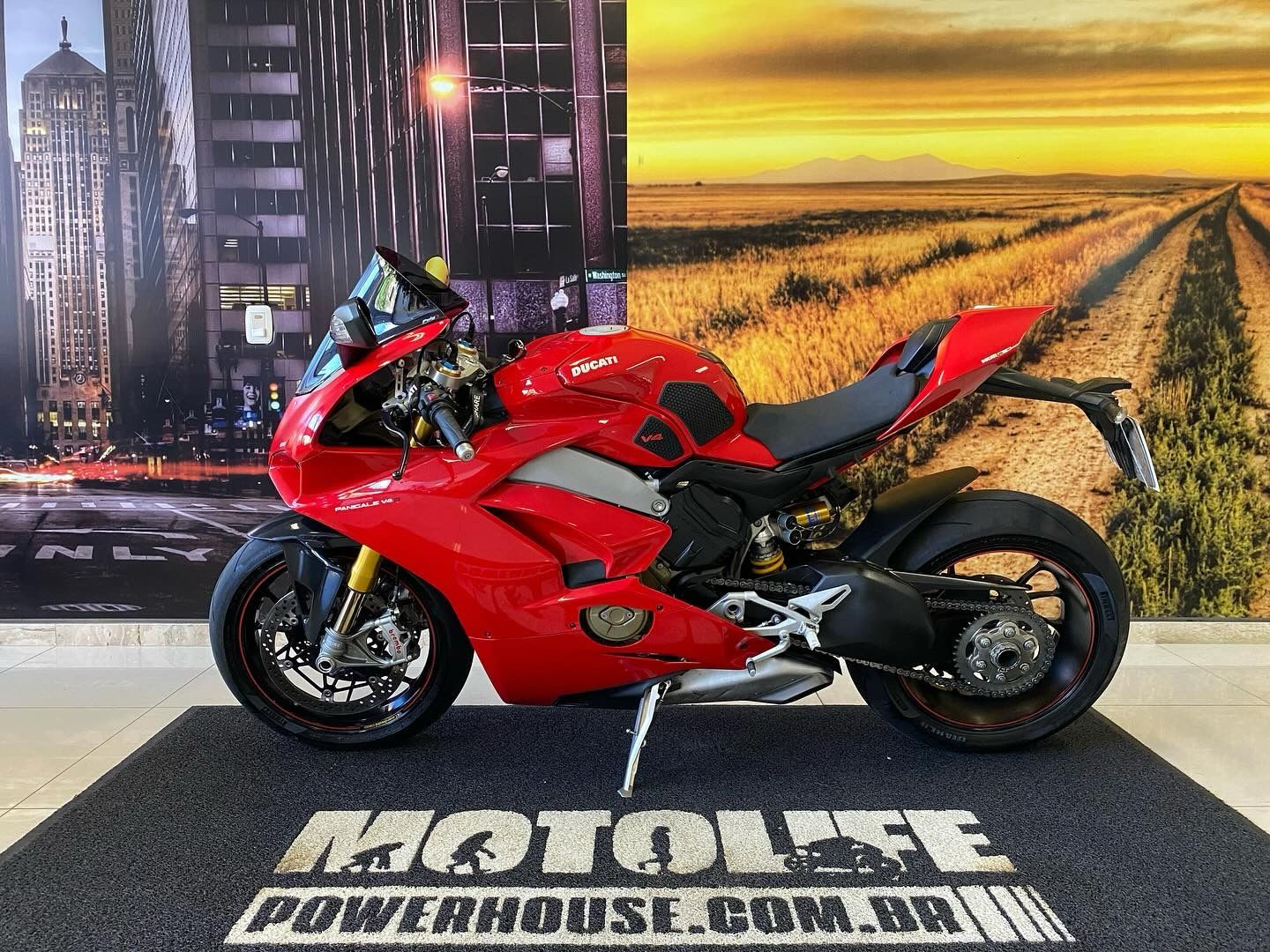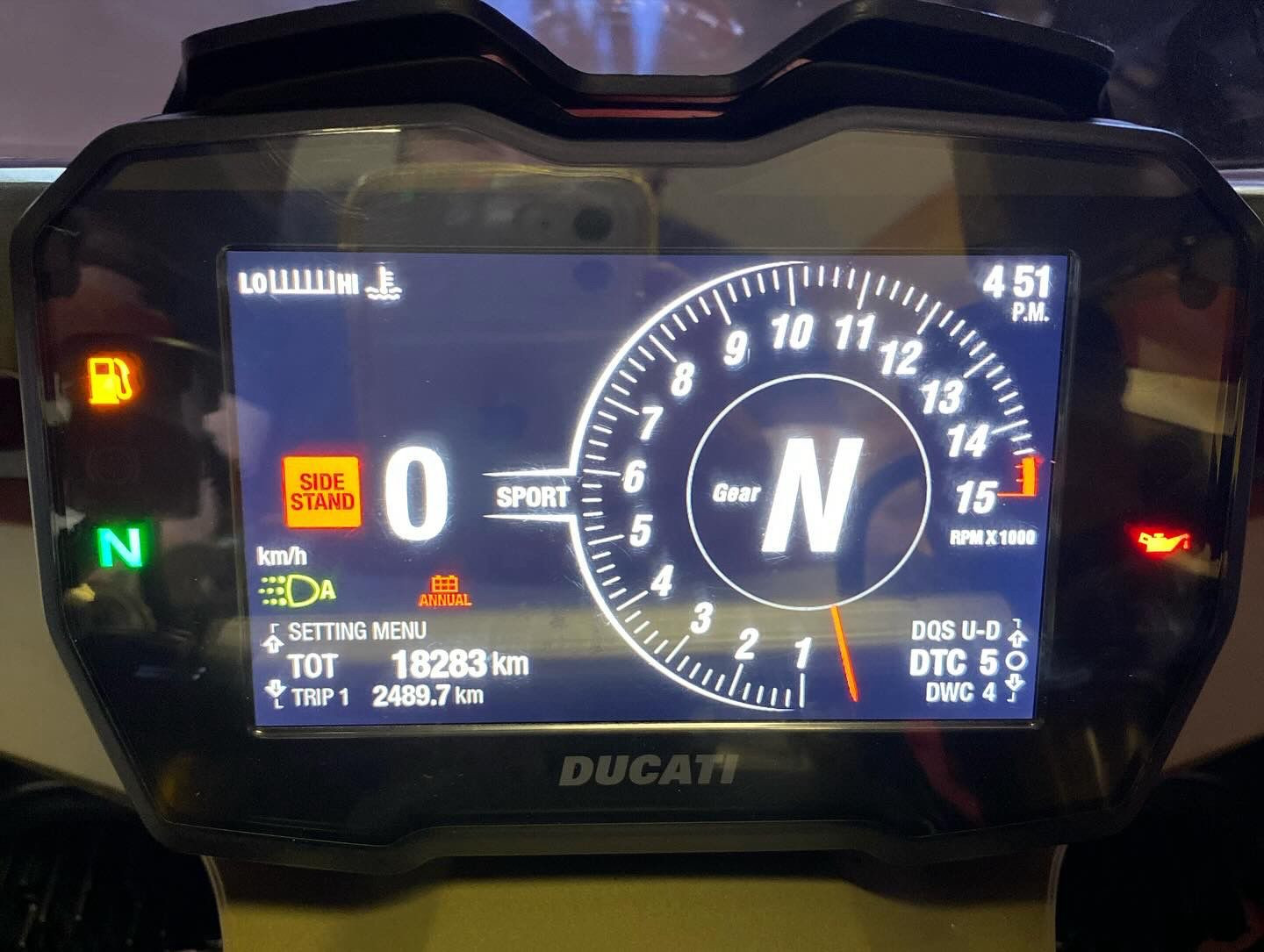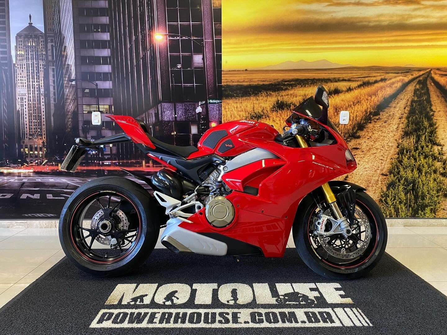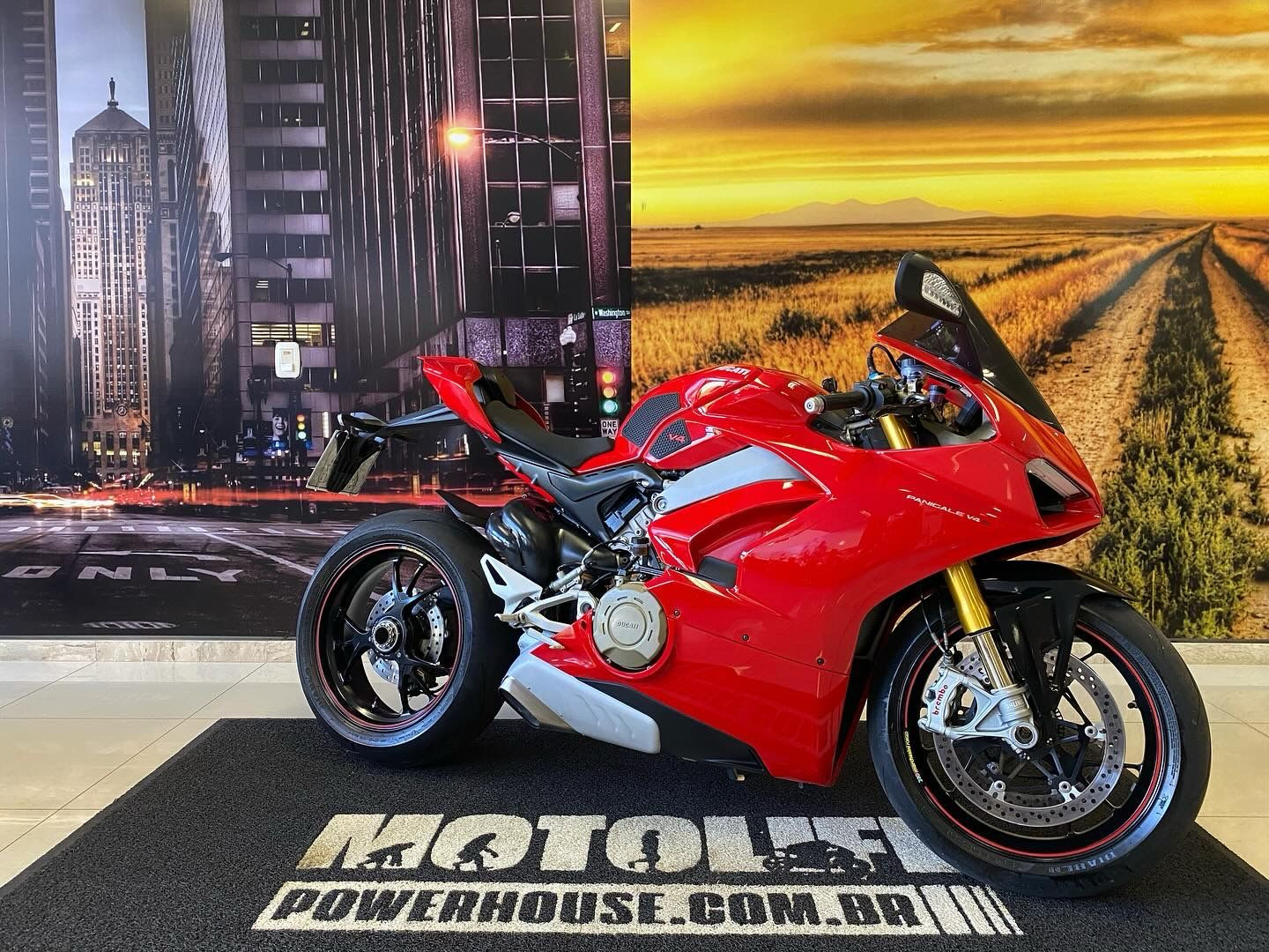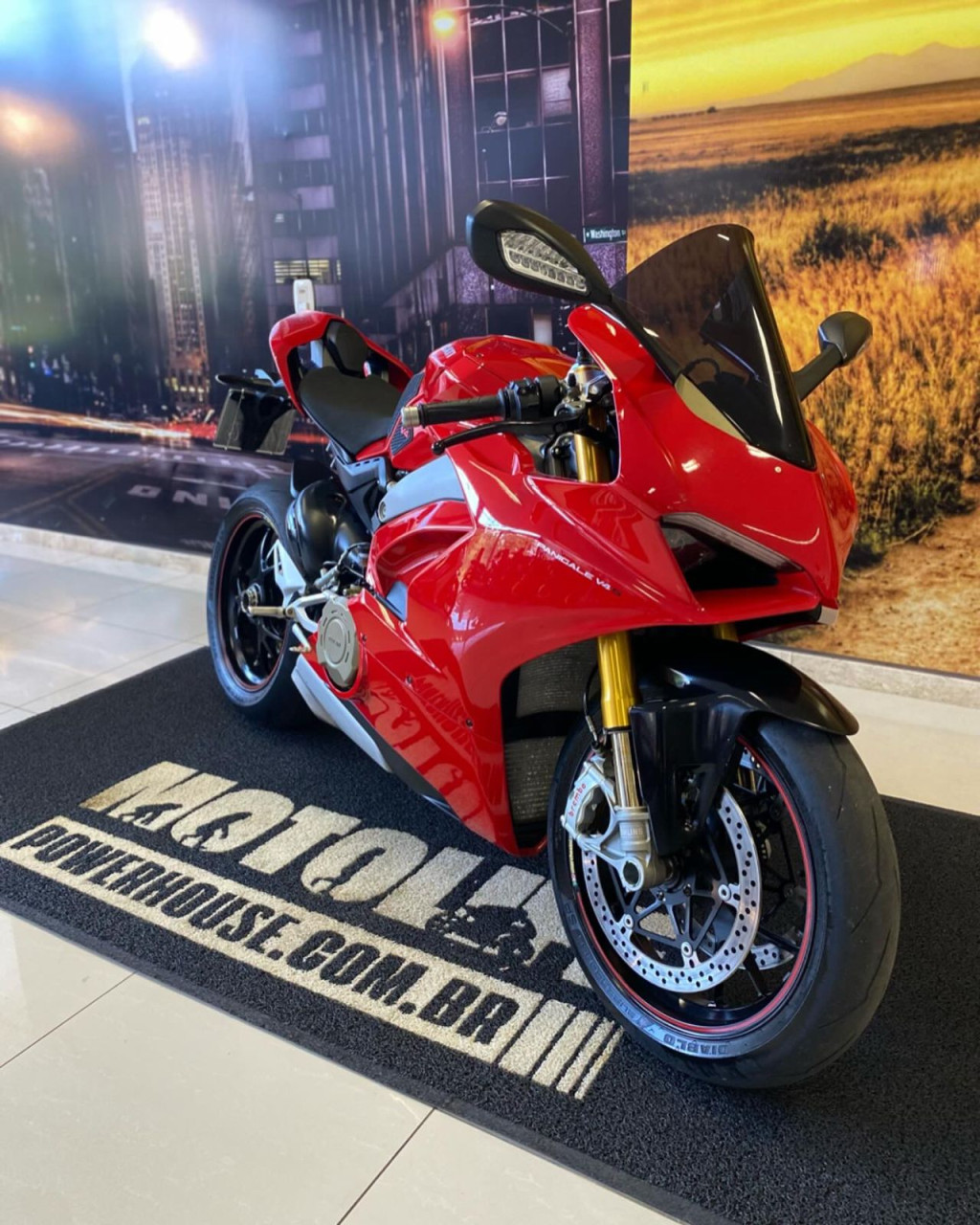 Suspensão Traseira: Unidade de Ohlins TTX36 totalmente ajustável. Ajuste eletrônico de compressão e amortecimento de rebote com modo semi-ativo. Ligação ajustável: Progressivo/plano. Braço de balanço unidirecional de alumínio
