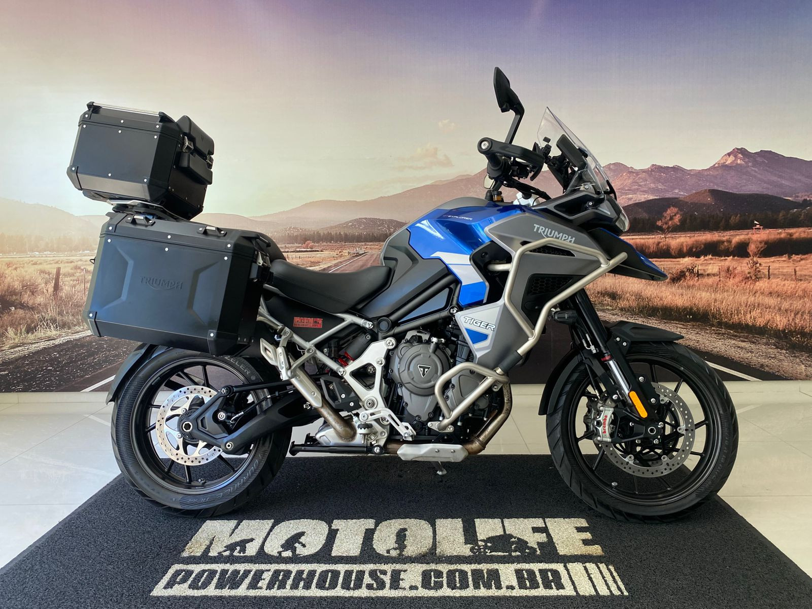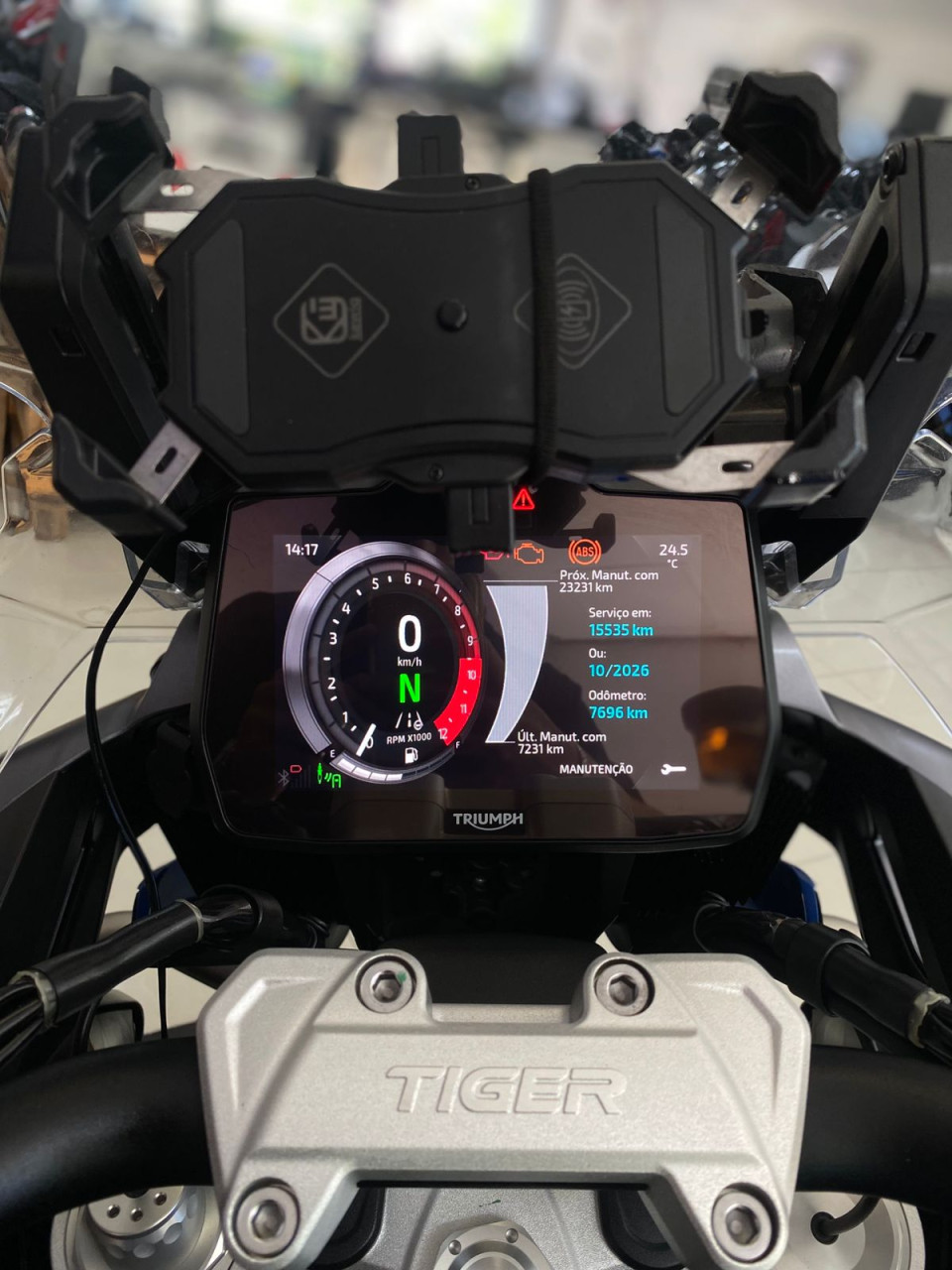 Suspensão traseira/Curso: Mono Showa semi‑ativa, 200 mm de curso, ajuste eletrônico de pré-carga e redução ativa da altura em até 20 mm ao parar