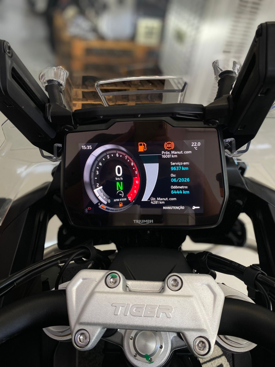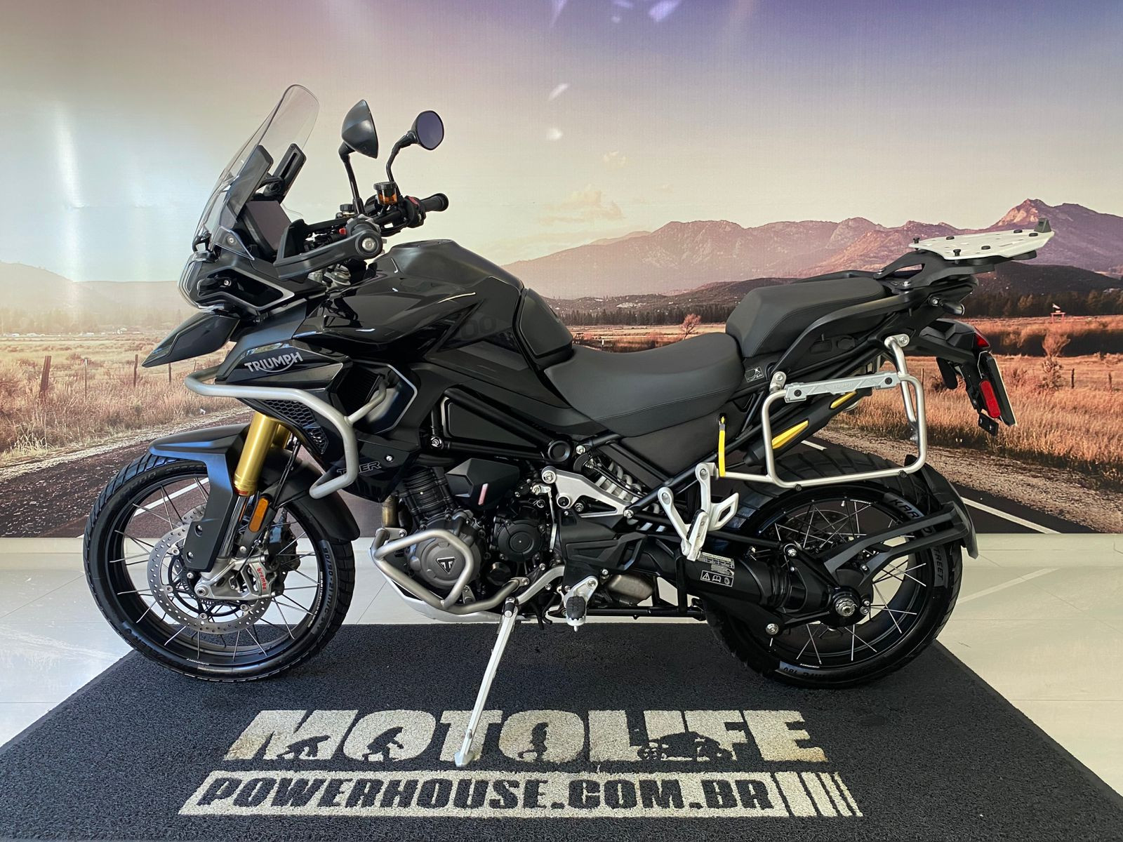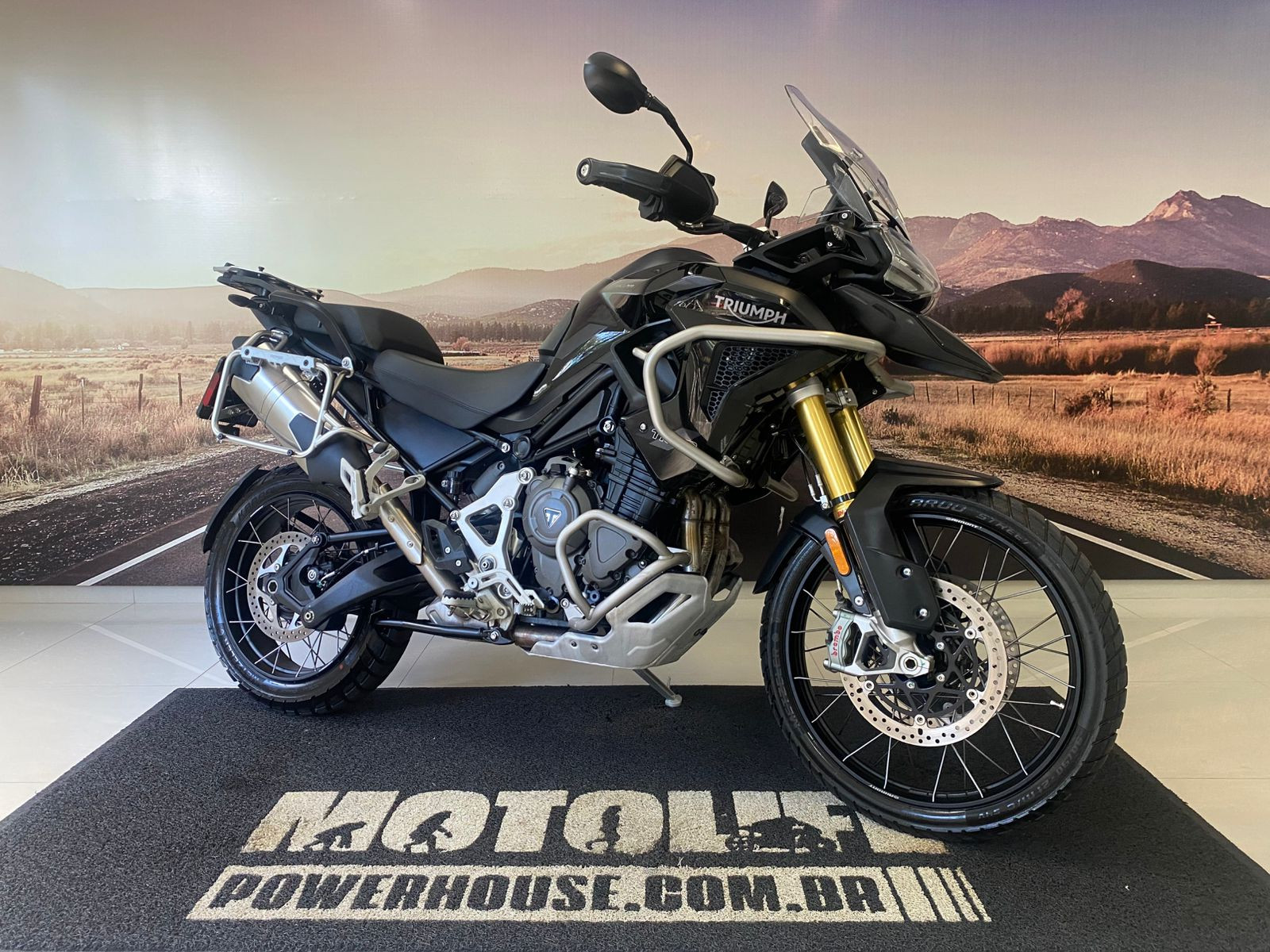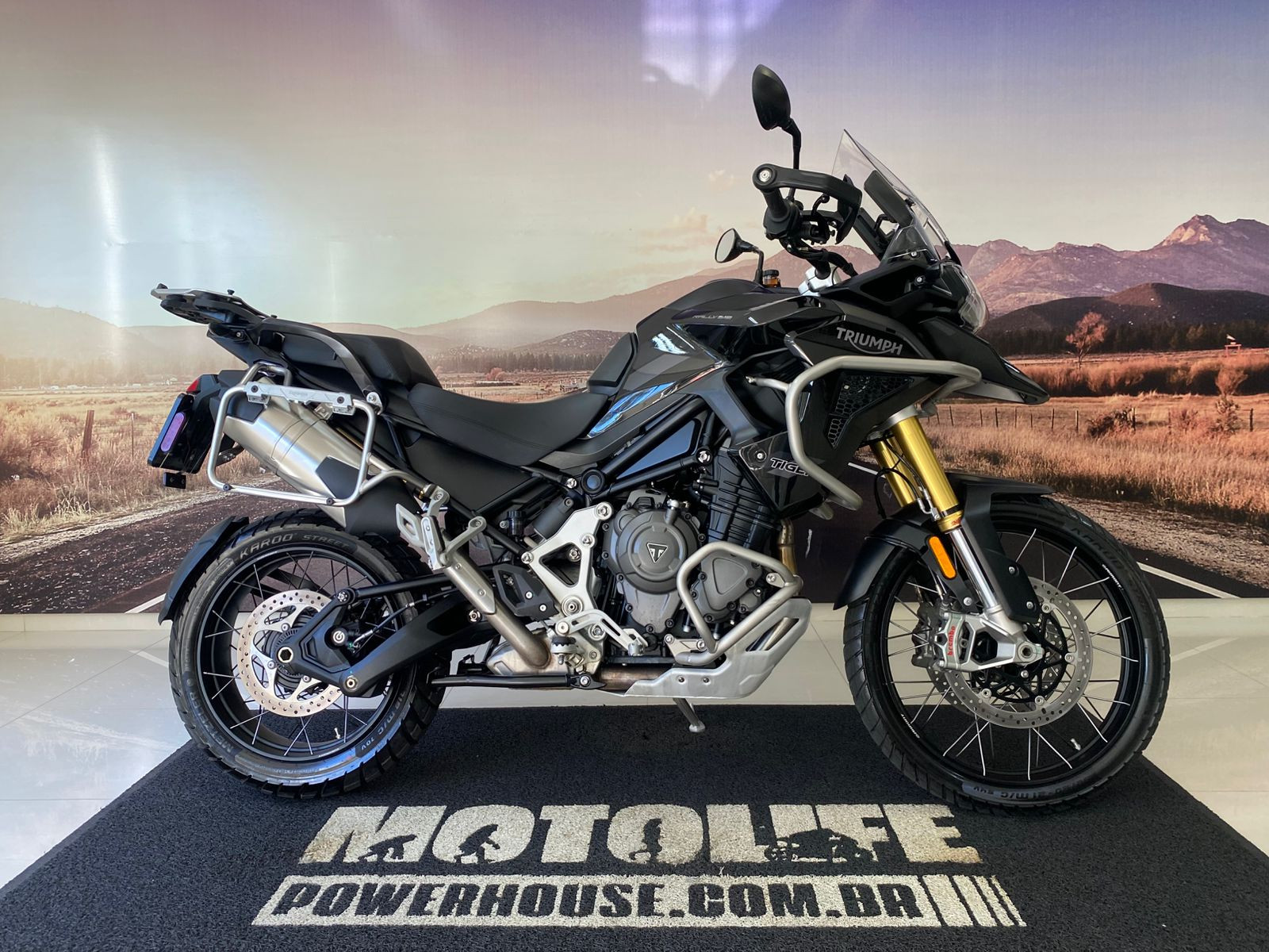 Suspensão traseira/Curso: Mono Showa semi‑ativa, 200 mm de curso, ajuste eletrônico de pré-carga e redução ativa da altura em até 20 mm ao parar